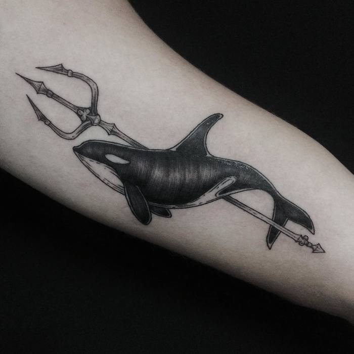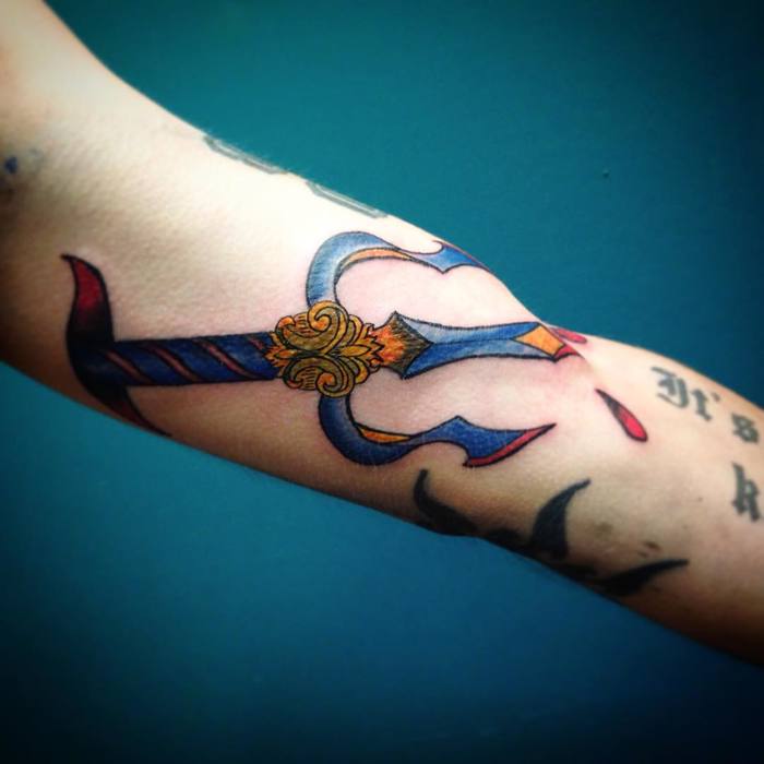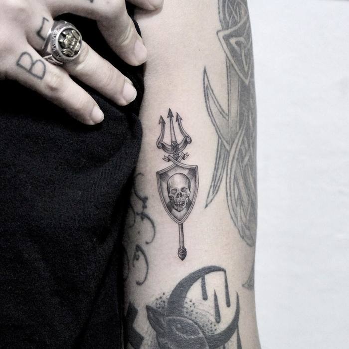 삼지창 문신의 의미는 신들의 미덕과 연결되어 마법의 힘, 지혜, 지배력을 상징한다.