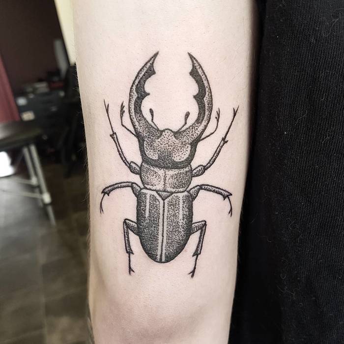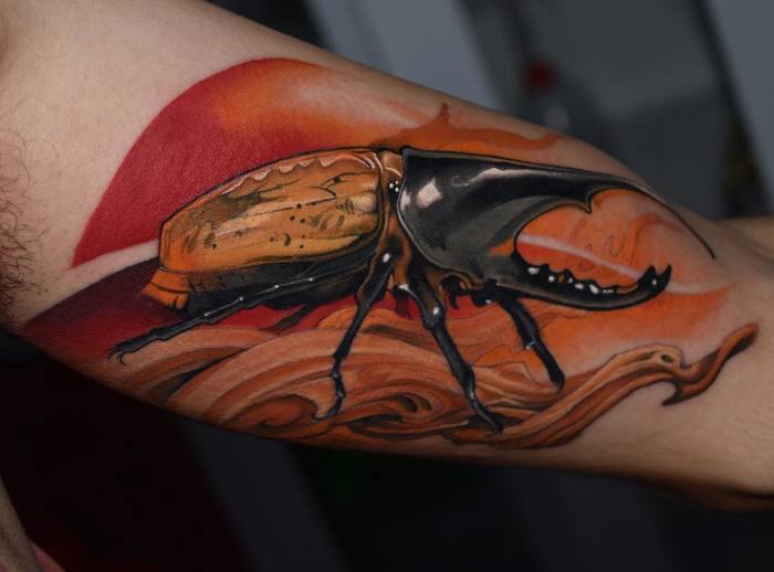 문신 예술에서 딱정벌레는 그들의 흥미롭고 다채로운 디자인과 상징적인 의미 때문에 문신을 위한 훌륭한 모델이 된다.