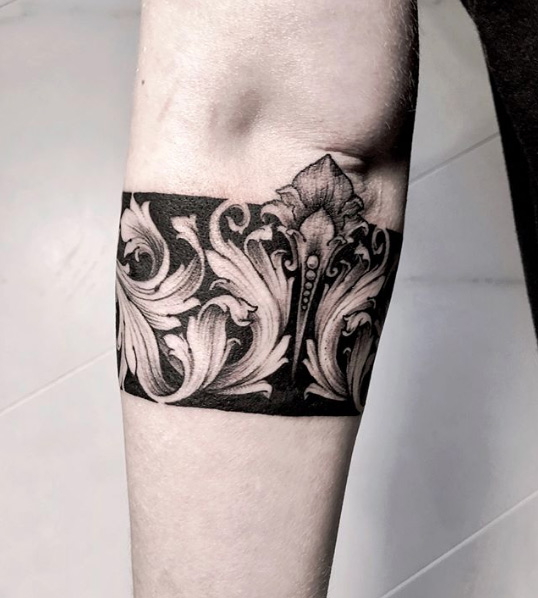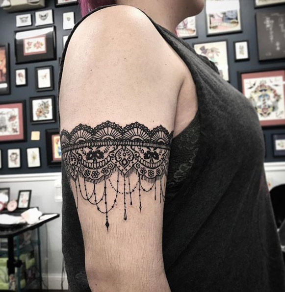 여자분들에게 인기가 좋은 스타일이죠!~ 여성적인 느낌이 많이 들기 때문이기도 하고, 이 레이스 암밴드 타투는 고급스러움이나 화려함도 같이 보여 집니다. 특히, 허벅지 부분에 이러한 레이스 디자인의 밴드타투는 엄청 섹시 하답니다.