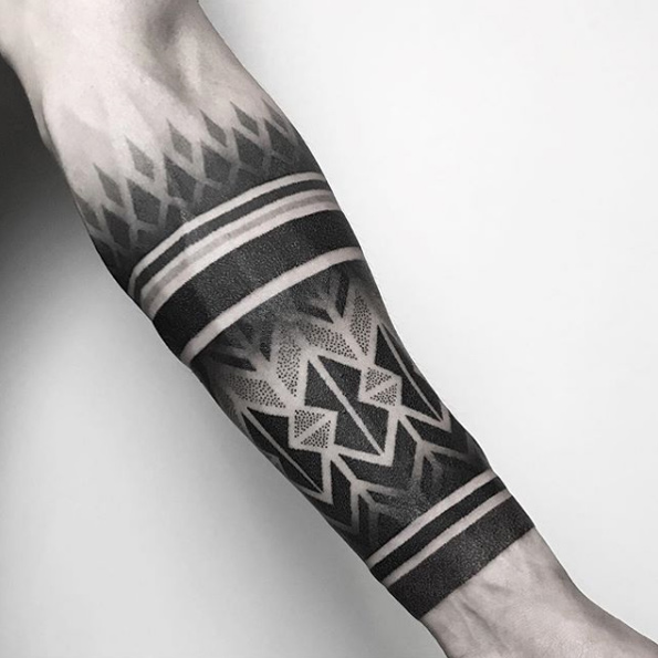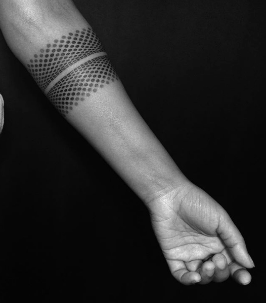 다양한 기법과 디자인이 들어가 있는 암밴드 타투예요!~ 점묘법으로 타투를 작업을 한 부분도 보이고, 도형의 패턴으로 암밴드 디자인이 되었어요~