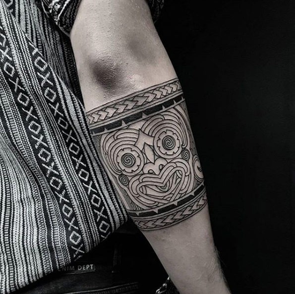 이것은 폴리네시안 타투를 암밴드 스타일로 보이네요!~ 폴리네시안 타투도 원주민타투, 트라이벌, 패턴 등과 어느정도 비슷하게 보이는 부분들이 있으니, 정확하게 어떤것인지 확인을 하시는 것도 중요해요!~