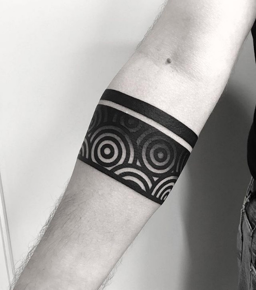 뭐든지... 단순하고 반복적인 것들이 눈에도 잘띄고, 심플한 멋을 내어 줍니다. 원형 도형을 모티브로 한 암밴드 타투입니다.