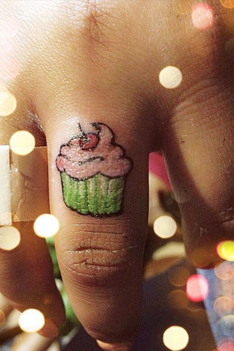 레터링과 작은 이미지가 결한된 손가락타투