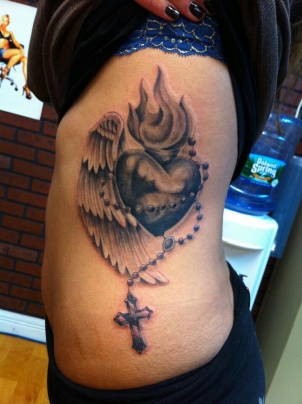 생동감 넘치는 하트 심장 타투입니다. 옆구리 쪽인데... 날개와 묵주목걸이, 게다가 불이 활활 타오르는 모습이 상당히 열정적입니다.