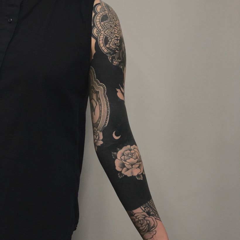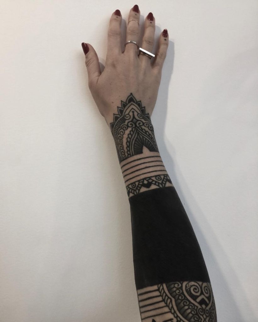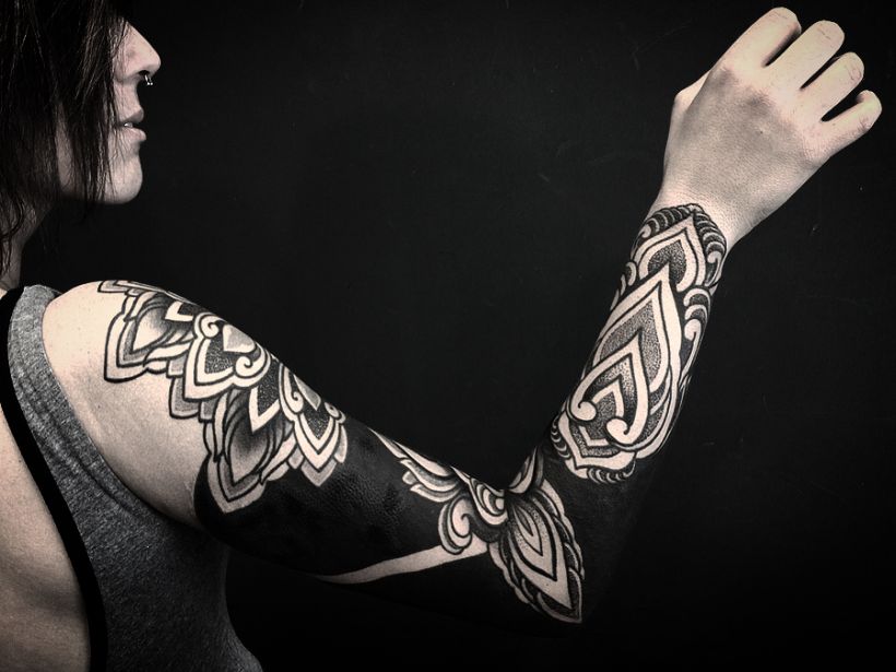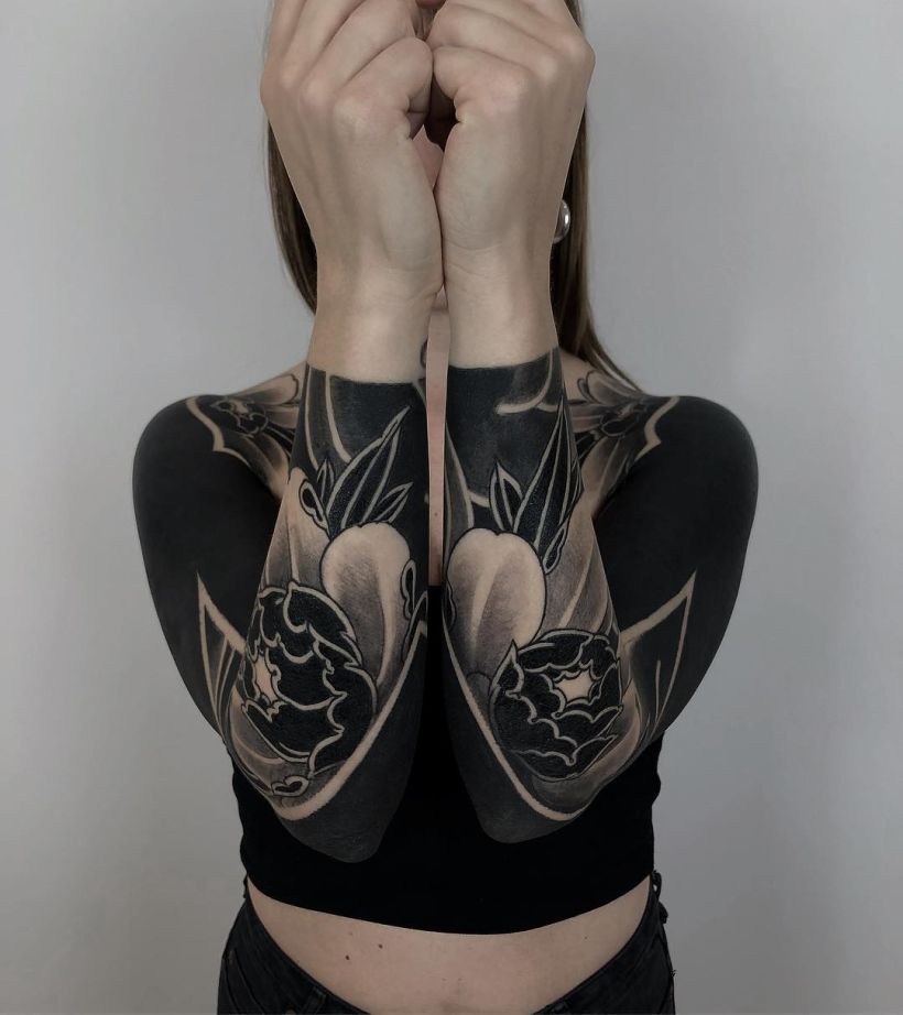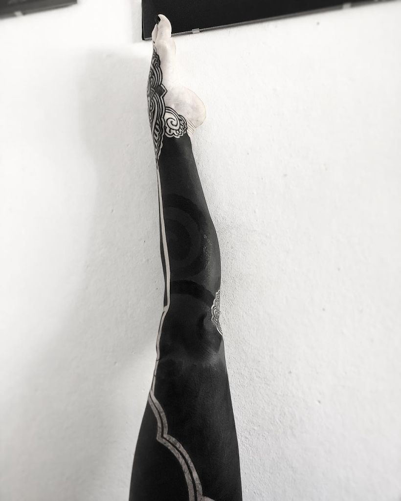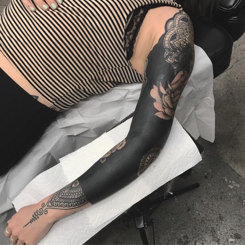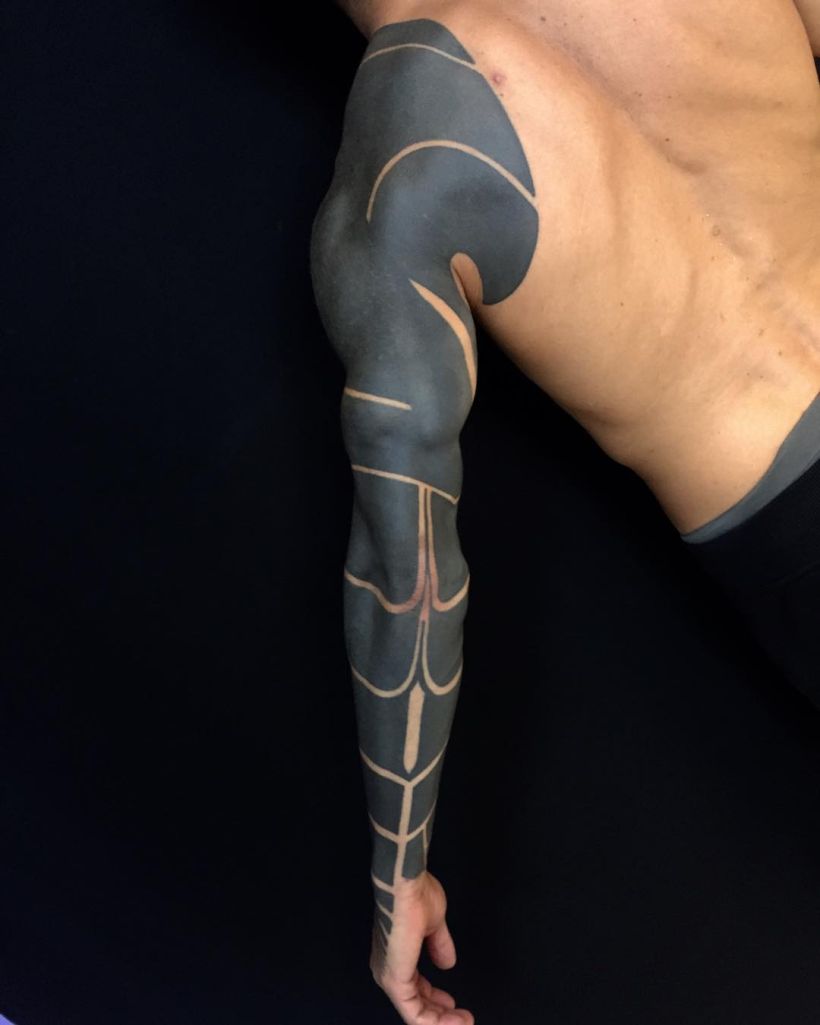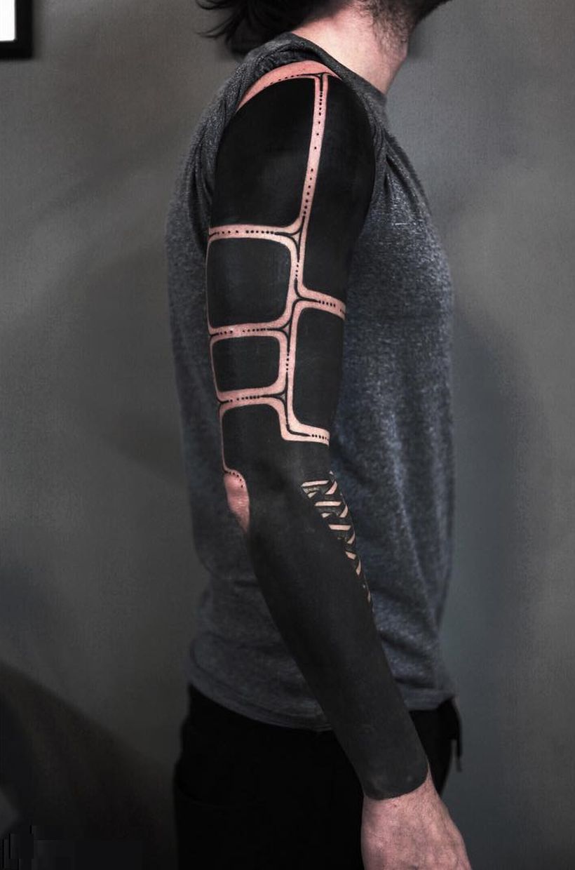 우선, 솔리드 블랙암 타투가 뭐야? 이러한 스타일은 기본적으로 어떠한 공간에 복잡한 기하학적 모양 같은 것들을 종종 비현실적으로 보이는 디자인을 창조하기 위해 사용하는 검은색면으로 채워진 타투이다. 블랙아웃 문신은 고대 신성한 부족 표시에서 진화한 신 트리벌 문신에서 영감을 받아 오직 검은 잉크로만 몸의 많은 부분을 타투로 하는 것을 말한다.