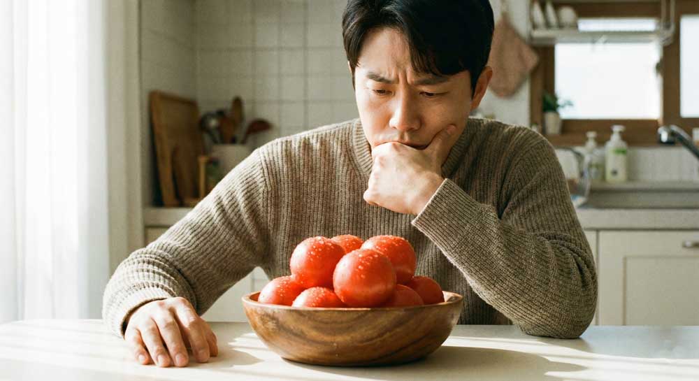 토마토는 최고의 슈퍼푸드지만, 아침 공복에는 이야기가 달라집니다. 토마토 속의 '타닌산'이라는 성분이 위산과 만나면 응집되어 딱딱한 덩어리를 만듭니다. 이게 위 내부 압력을 높여 통증을 유발하고 심하면 위궤양까지 이어질 수 있어요.