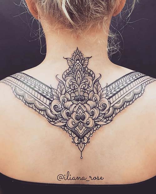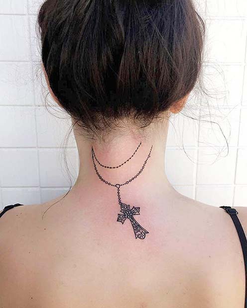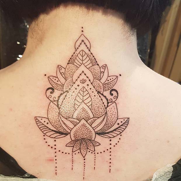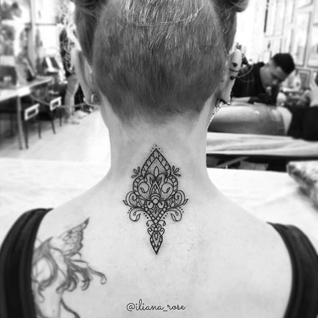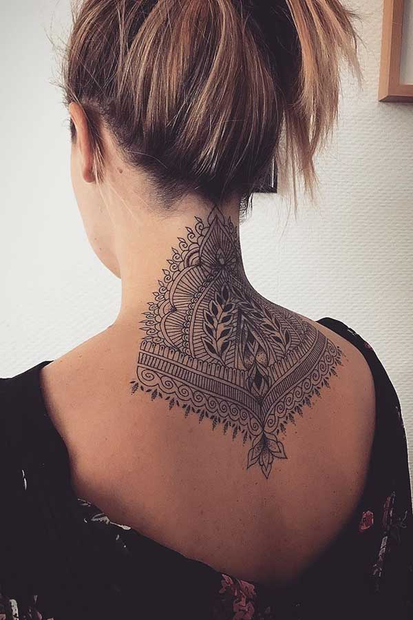 목뒤 부위는 매우 특이한 부위이며, 색다른 멋을 준다. 게다가 작은 타투일경우는 머리카락에 덮일수 있고, 목에서 어깨까지 대담하게 디자인이 가능하고, 헤어스타일에 따라 다양하고 미묘한 느낌을 준다.