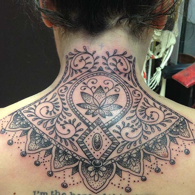 목뒤 부위는 매우 특이한 부위이며, 색다른 멋을 준다. 게다가 작은 타투일경우는 머리카락에 덮일수 있고, 목에서 어깨까지 대담하게 디자인이 가능하고, 헤어스타일에 따라 다양하고 미묘한 느낌을 준다.