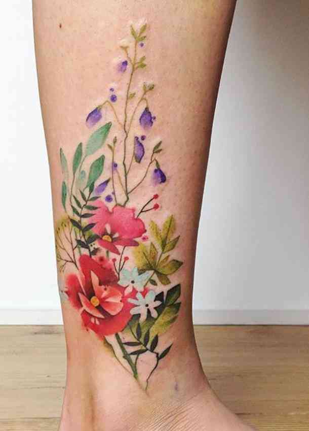 이러한 수채화 타투는 봄이나 여름에 꽃밭을 거니는 느낌을 주기도 하죠!~ 훨씬 더 멋지게 이 타투가 보여지려면, 발목위 10~20cm 정도 까지 오는 하늘거리는 치마나 바지가 더욱 당신을 아름답고 화려하게 보이게 할 수 있다는 것을 기억해 주세요!~