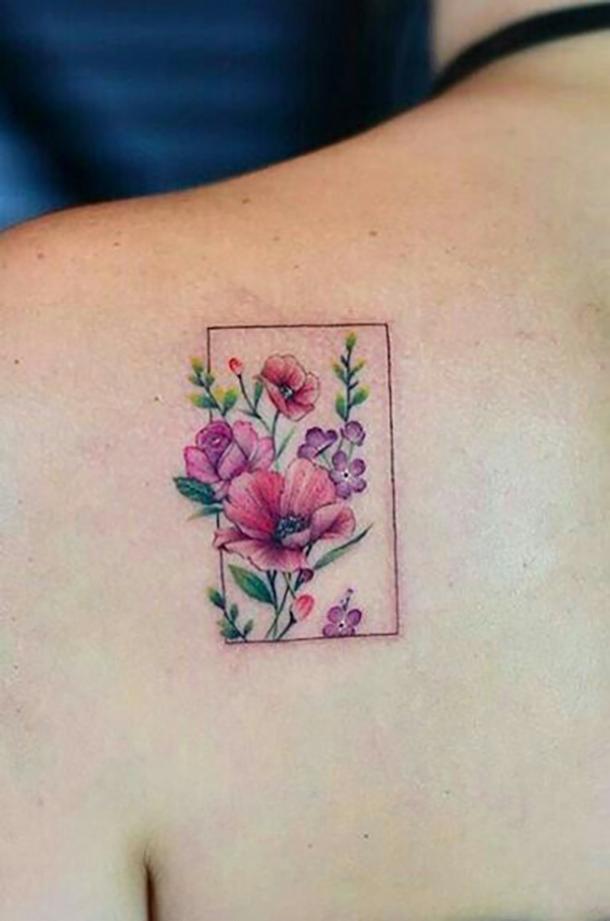 여성분들의 어깨 뒷쪽으로의 화려한 색의 꽃타투는 정말 아름다운 타투라고 볼수 있습니다. 특히, 문신 타투가 옷을 입었을때 보여지기를 꺼려한다면, 이러한 위치도 아주 좋습니다.