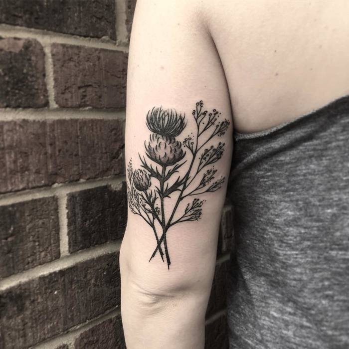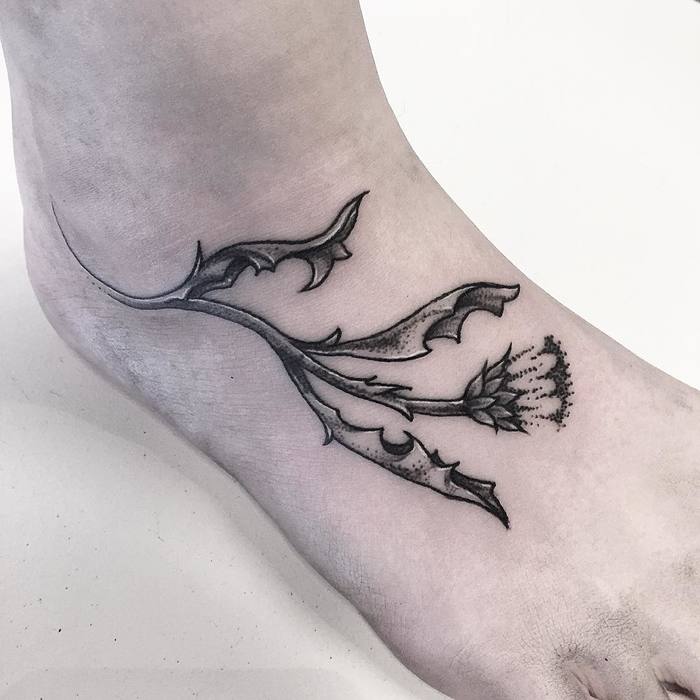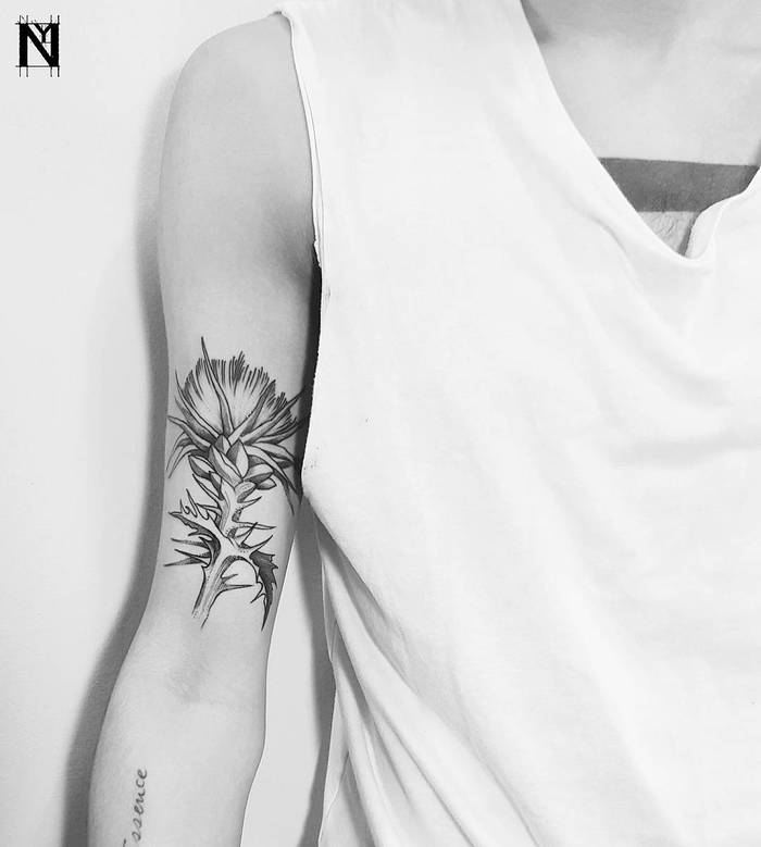 엉겅퀴 타투는 큰 고난 앞에서 자존심, 결단력, 끈기, 강인함의 상징이 될 수 있다.