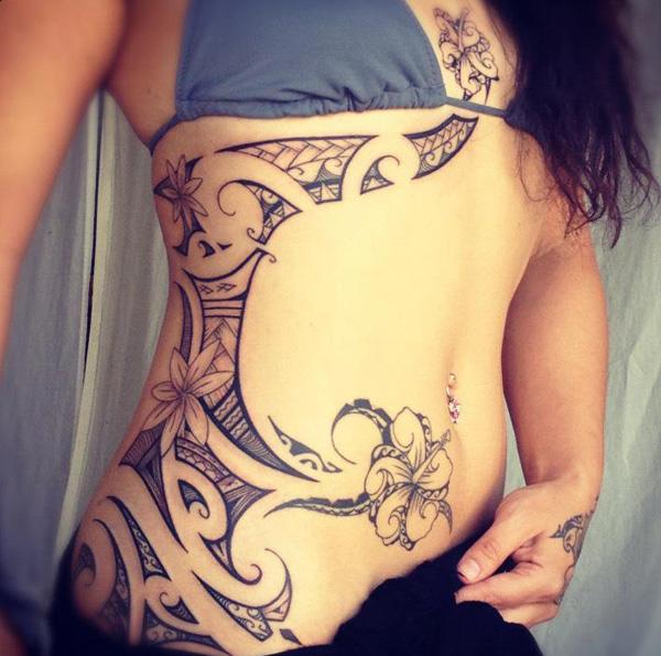 폴리네시안 마오리 꽃도안이 가미된 여성적인 타투 디자인