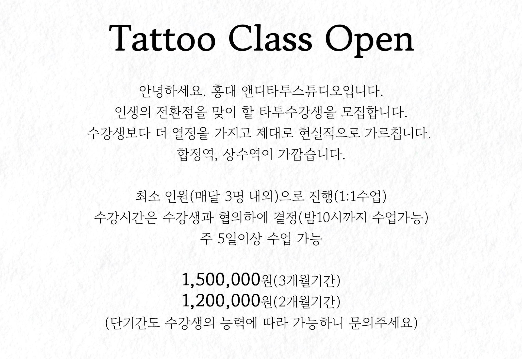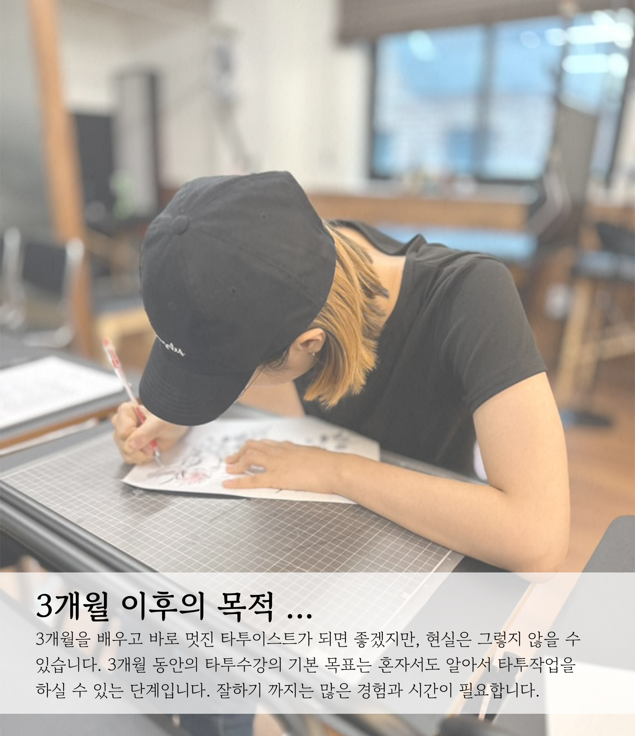 기본은 주 2회 이상 타투수강을 하셔야 하고, 기본 3시간 이상을 하시면 됩니다.