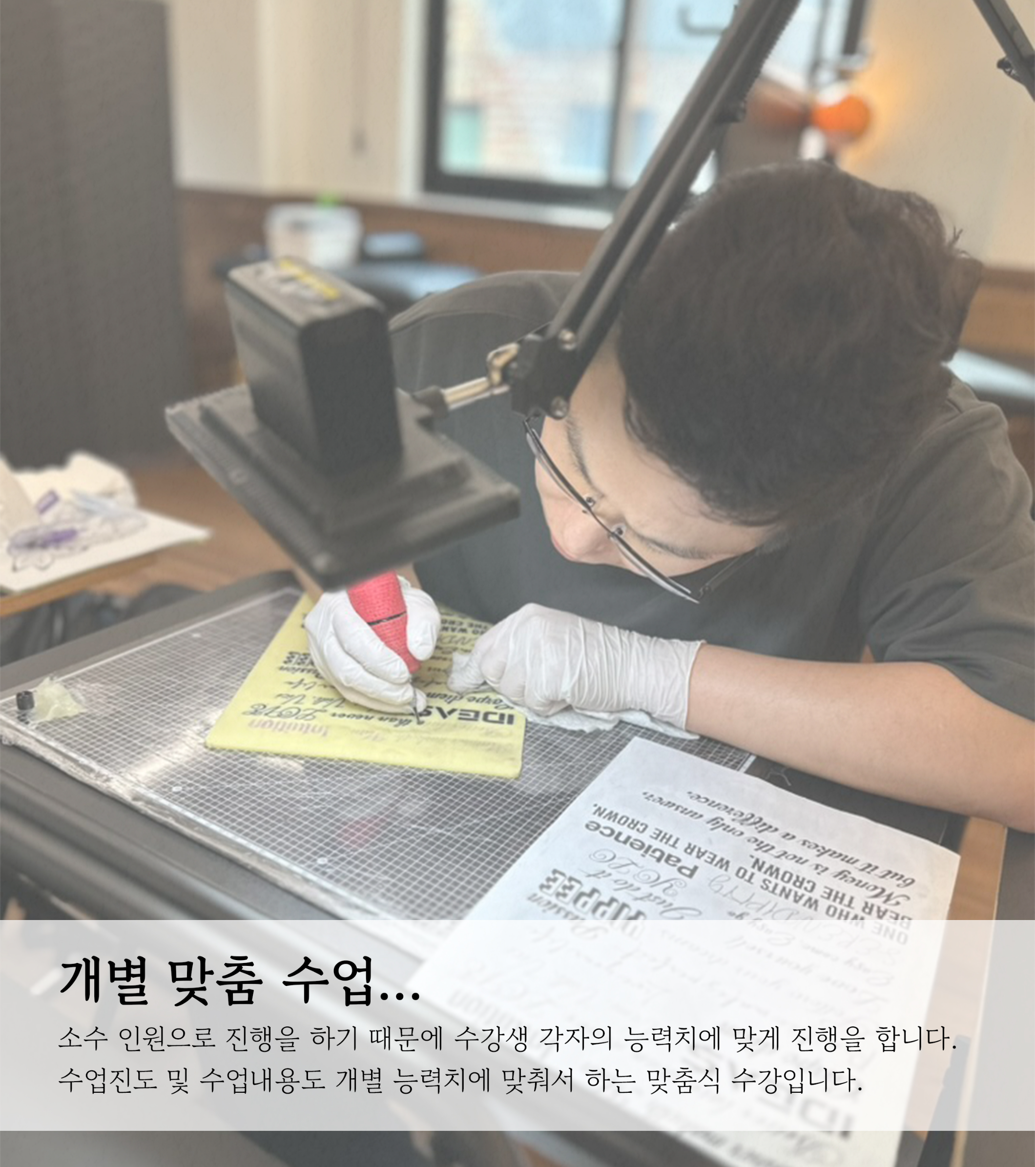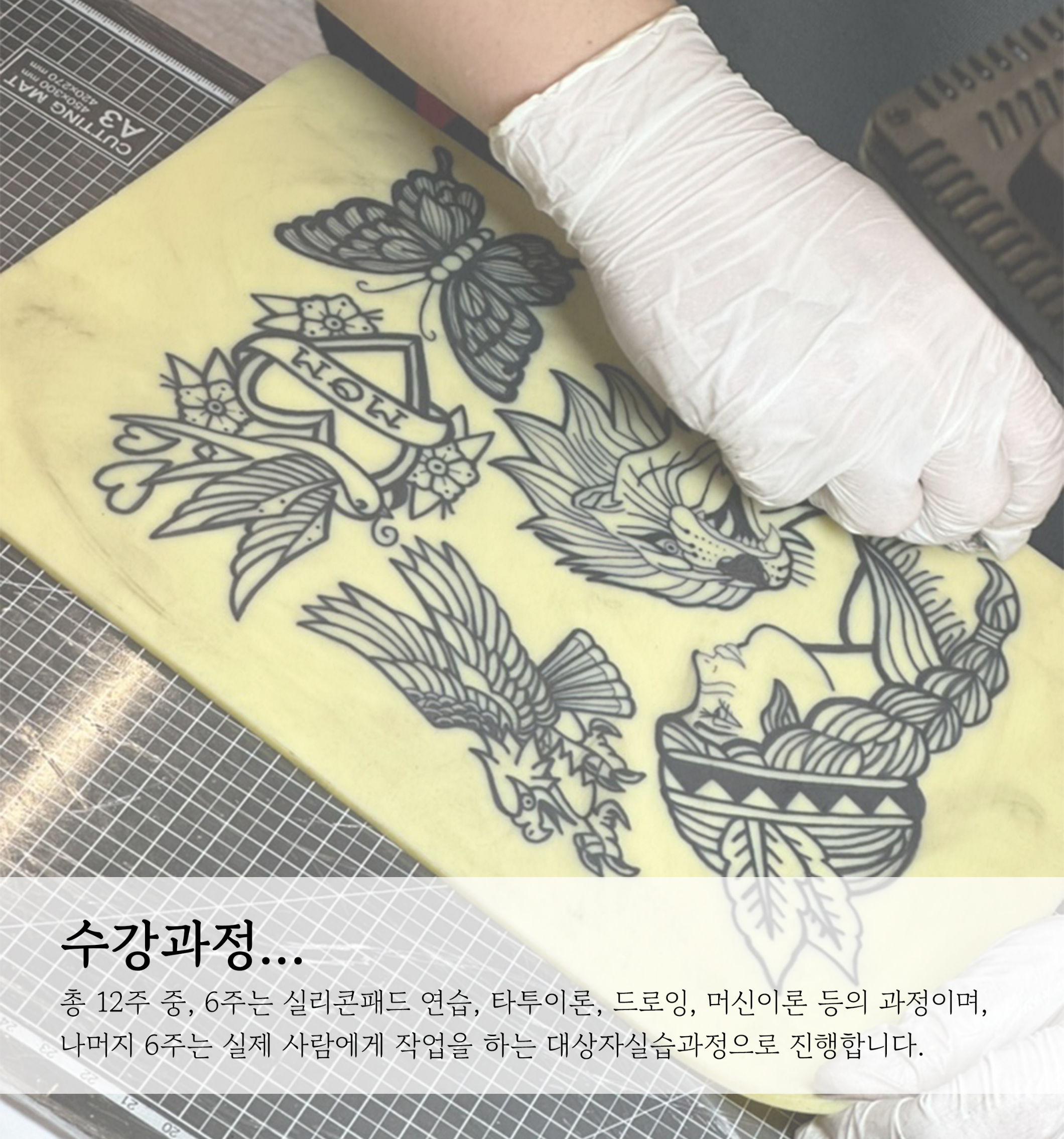 수강과정은 크게 1.실리콘패드 연습, 타투이론, 그림이론, 머신 및 바늘... 등의 연습과 이론과정과 2.실제 사람에게 하는 대상자 실습과정으로 두개의 과정으로 나누어져 있습니다.