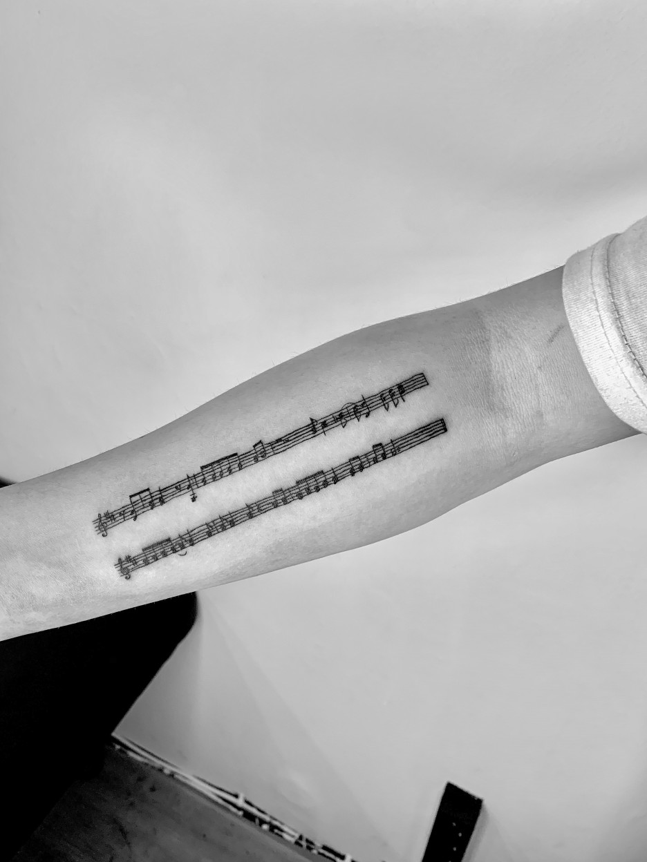 음악을 하시는 분이 좋아하는 음악의 한 구절의 악보를 타투로 작업을 하였어요.