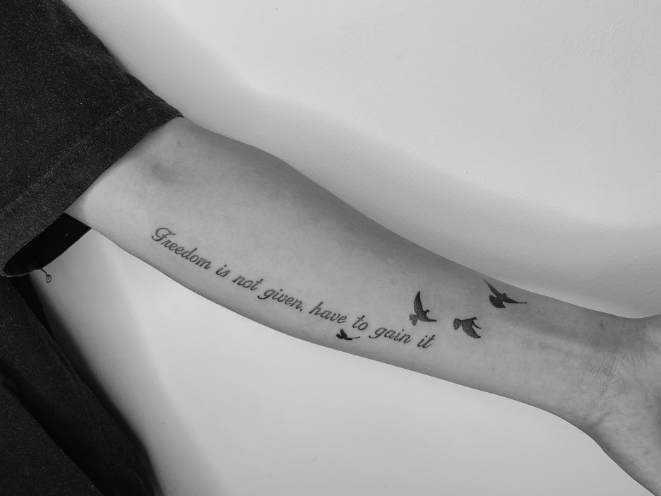 오른쪽의 레터링타투의 내용과 어울리게... 날아가는 새도 같이 새기셨어요~