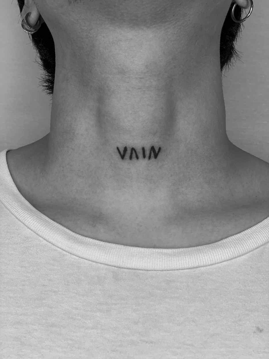 목젖 바로 아래쪽에 직접 쓴 글씨로 타투로 작업을 해드렸어요~