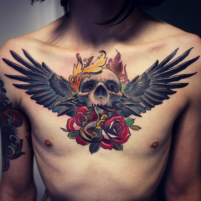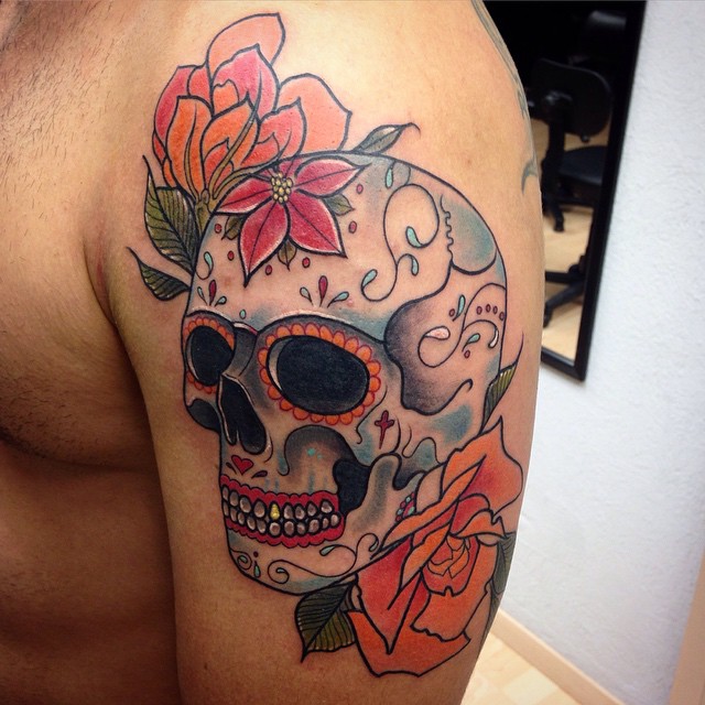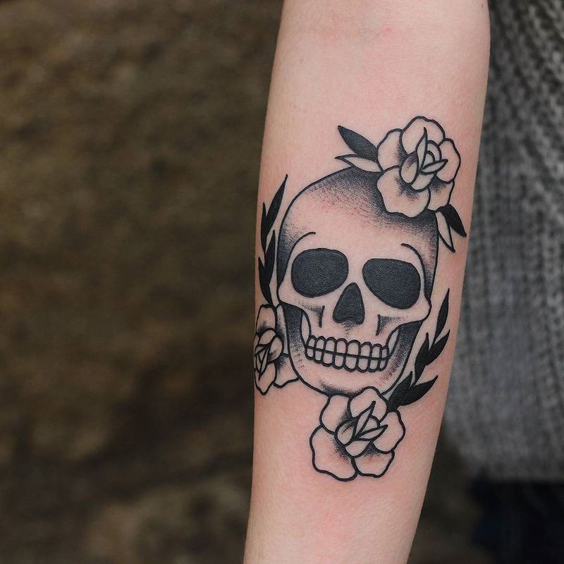 2). 짙은 색으로 수놓은 장미가 그려진 스컬 문신 모델. 악과 선함이 공존한다는 뜻이다.