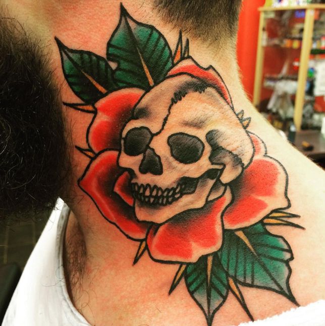 장미가 그려진 스컬타투는 종종 오토바이 단체와 갱단의 상징으로 알려져 있다.